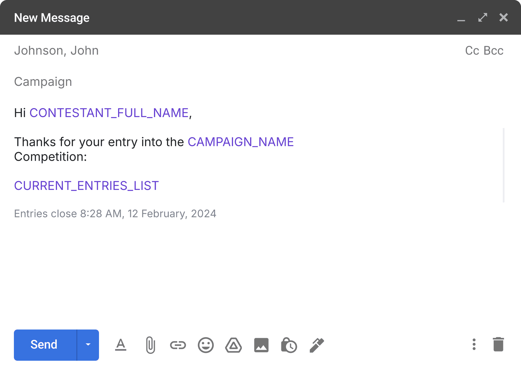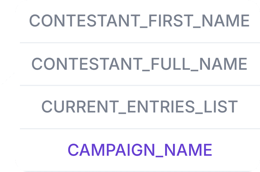 Easily configure personalized post-entry emails that align with your marketing campaign. Add branded HTML, use {tokens} to insert each user’s email address or name, and include instructions, disclaimers, or even your terms and conditions to comply with federal, state, and local laws.