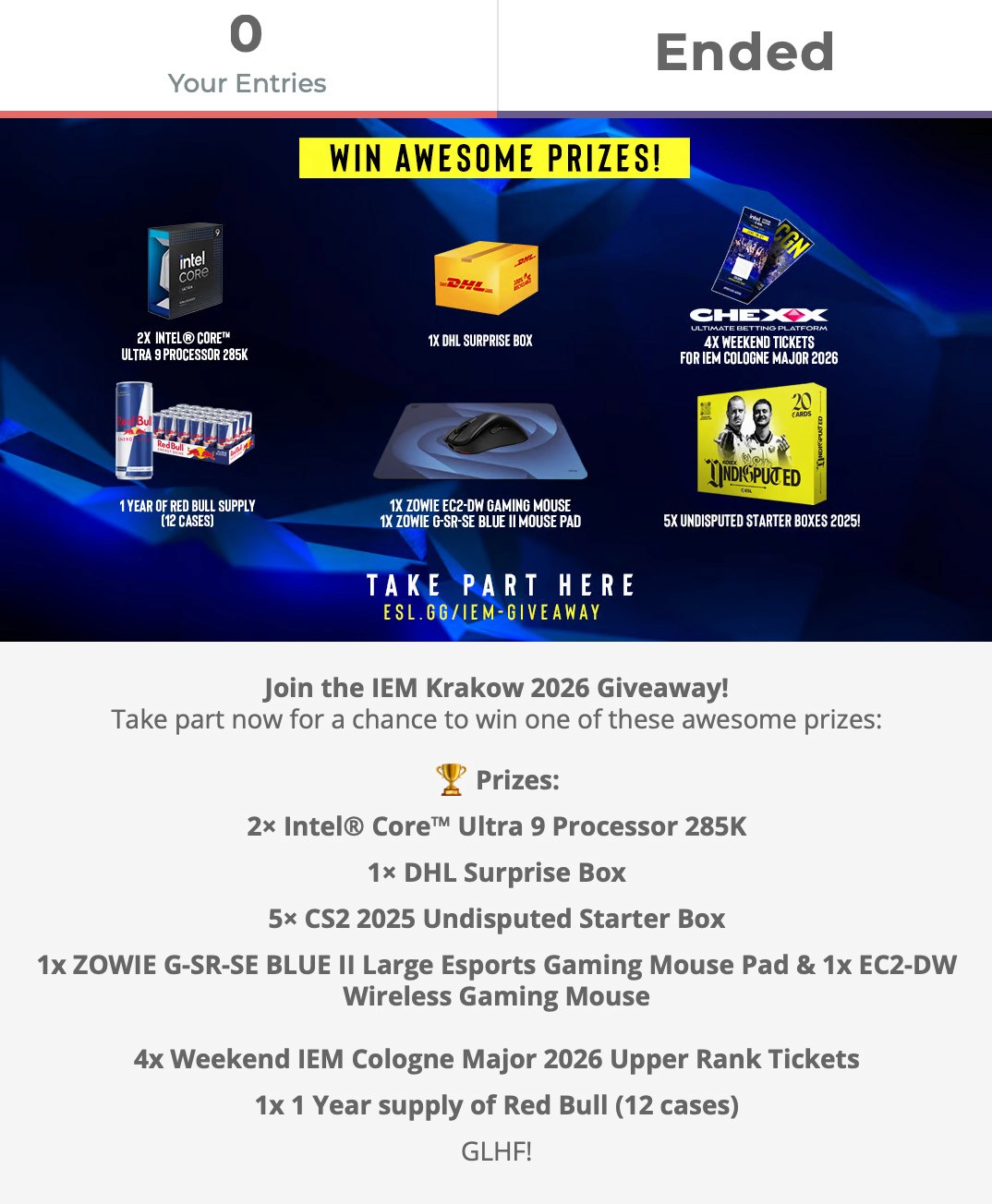 Fans could win prizes from partners including Intel, DHL, ZOWIE, Kolex and Red Bull, such as gaming hardware, CS2 starter boxes and IEM Cologne 2026 tickets.